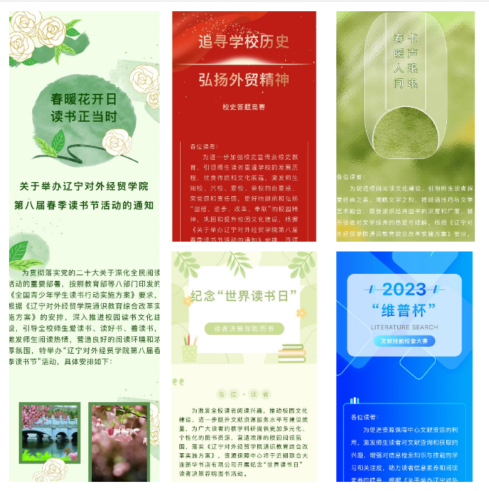 创新活动形式,营造阅读氛围。本届读书节以“春暖花开日 读书正当时”为主题,举办历时近一个月的多元化读书活动,有激发师生知校、兴校、爱校、荣校的首届“追寻学校历史 弘扬外贸精神”校史答题竞赛;有将朗诵技巧与文学艺术融合的“春暖人间 书声琅琅”线上朗读通识经典图书大赛;有助力构建多元化、个性化图书资源的纪念“世界读书日”决策荐购图书活动;也有助力提升信息素养和科教水平的数字文献资源检索与利用讲座进教研室服务等12项线上线下相结合的阅读推广活动,让师生读者在互动中加深对阅读的理解,更好的激发阅读兴趣,营造浓厚的校园阅读氛围。
