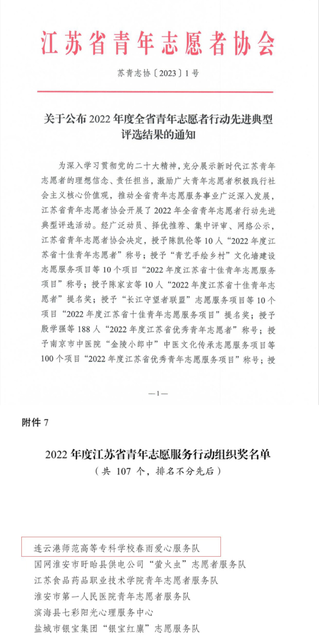 近日,江苏省青年志愿者协会公布了2022年度全省青年志愿者行动先进典型评选结果。数学与信息工程学院春雨爱心服务队荣获“2022年度江苏省青年志愿服务行动组织奖”。