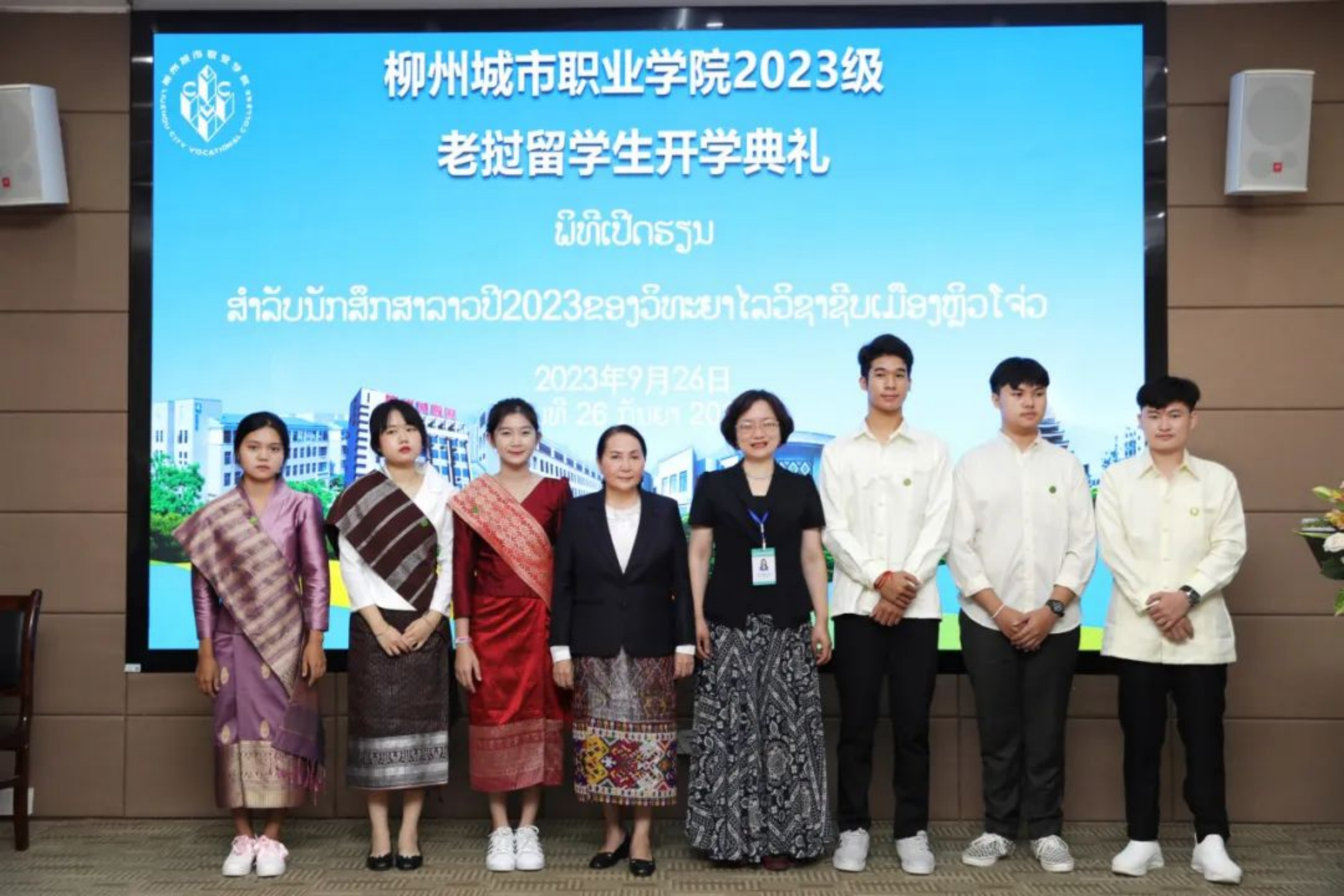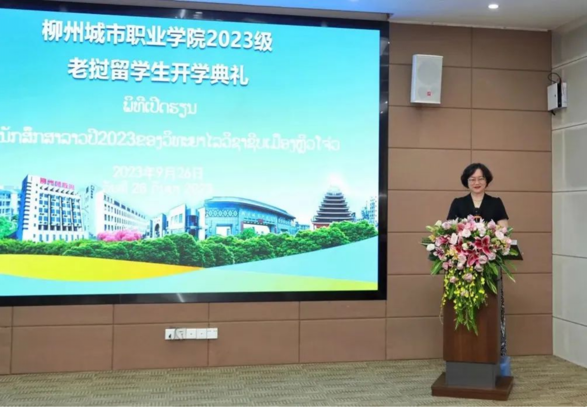 9月26日上午,柳州城市职业学院举行2023级老挝新生开学典礼。老挝教育与体育部学生事务司代理司长彤米•段萨达(THONGMY DUANSAKDA)、老挝甘蒙城市职业技术学院中文语言中心主任申塔万•翁帕占(SENGTAVANH VONGPHACHANT)一行8人,柳州城职院校长苏敏,副校长刘洪波参加开学典礼。