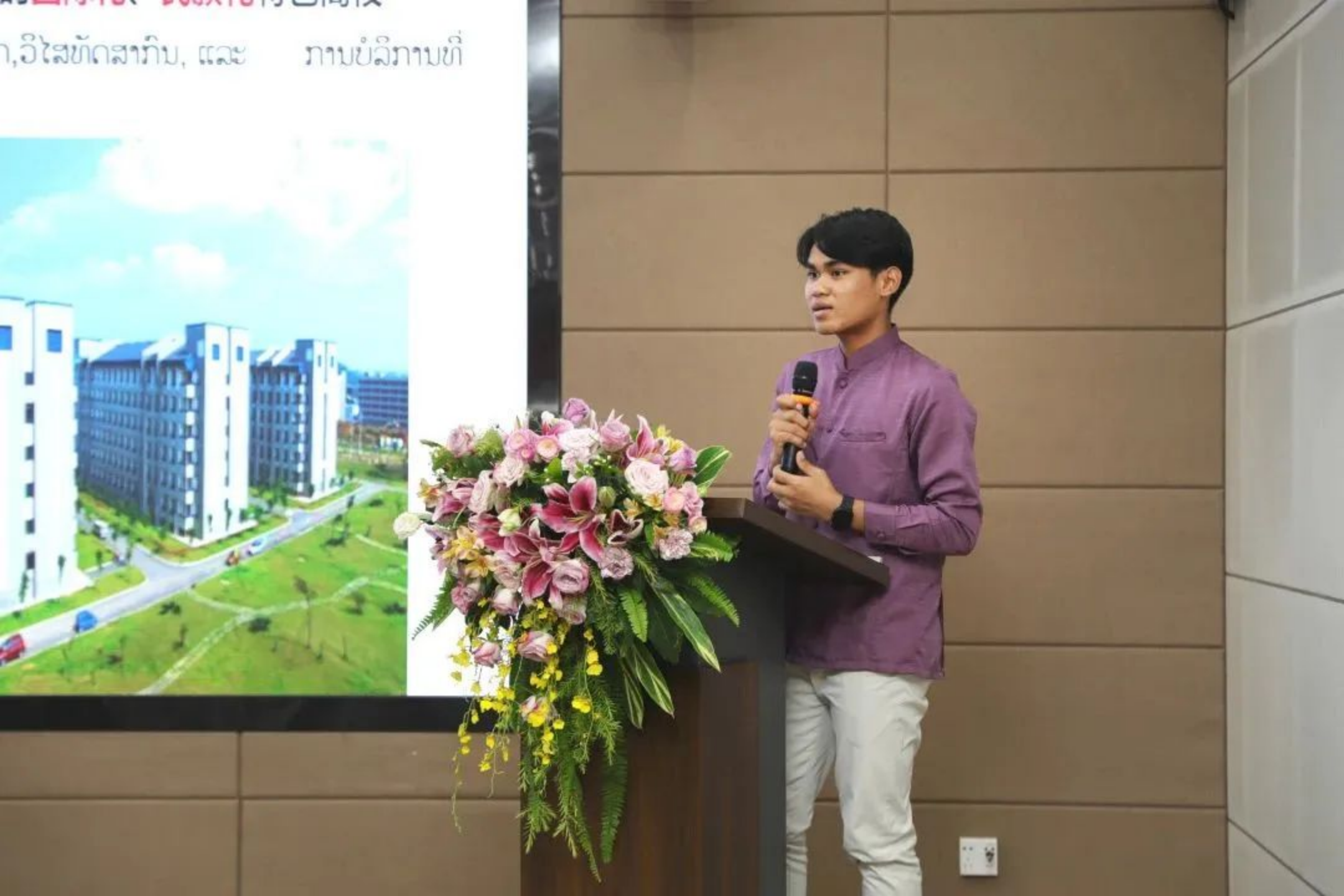 宋威龙同学代表学校2021级老挝学生发言,他用老挝语给2023级新生介绍了学校各二级学院情况,并告诉新生们学校学习环境好,生活条件也非常棒,领导老师们都非常关心大家,希望2023级新生们珍惜机会,在这里认真学习,学有所成,将来回老挝有更大的发展。