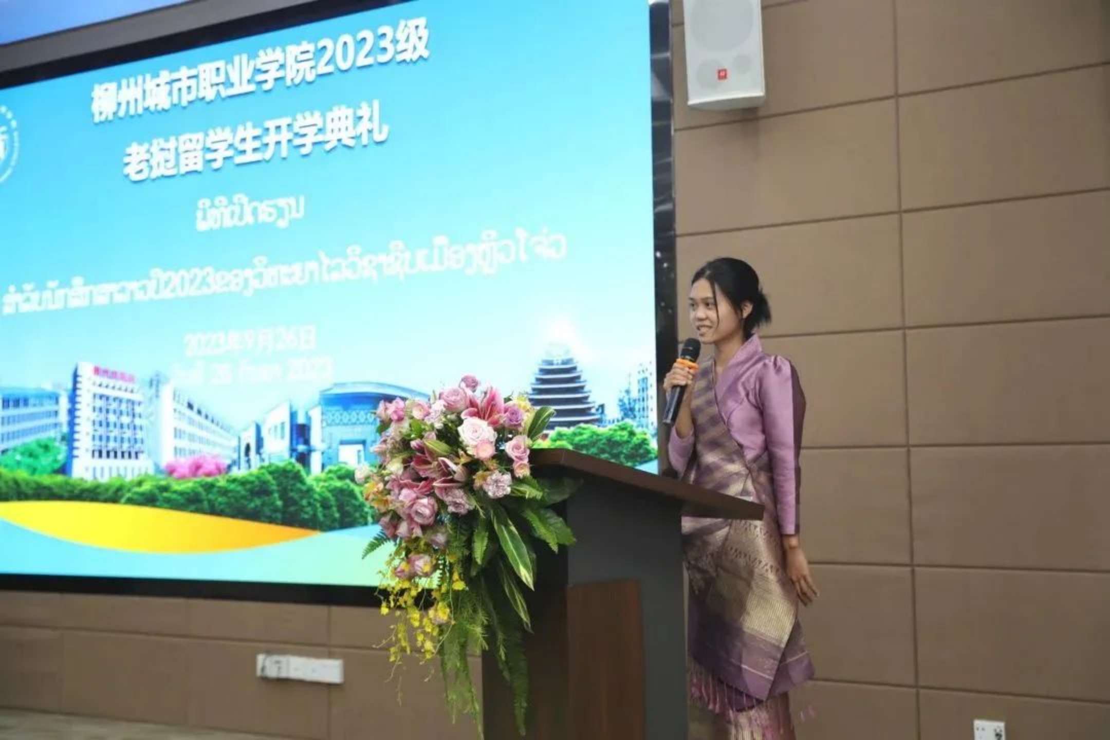 杨诗悦同学代表学校2023级老挝新生发言,表示在未来的大学生活中,一定会和同学们友好相处,共同营造团结友爱的氛围,尊敬老师,认真学习。努力提高自己的实践能力,掌握专业的职业技能。遵守学校的各项规章制度,培养高尚的思想品德。