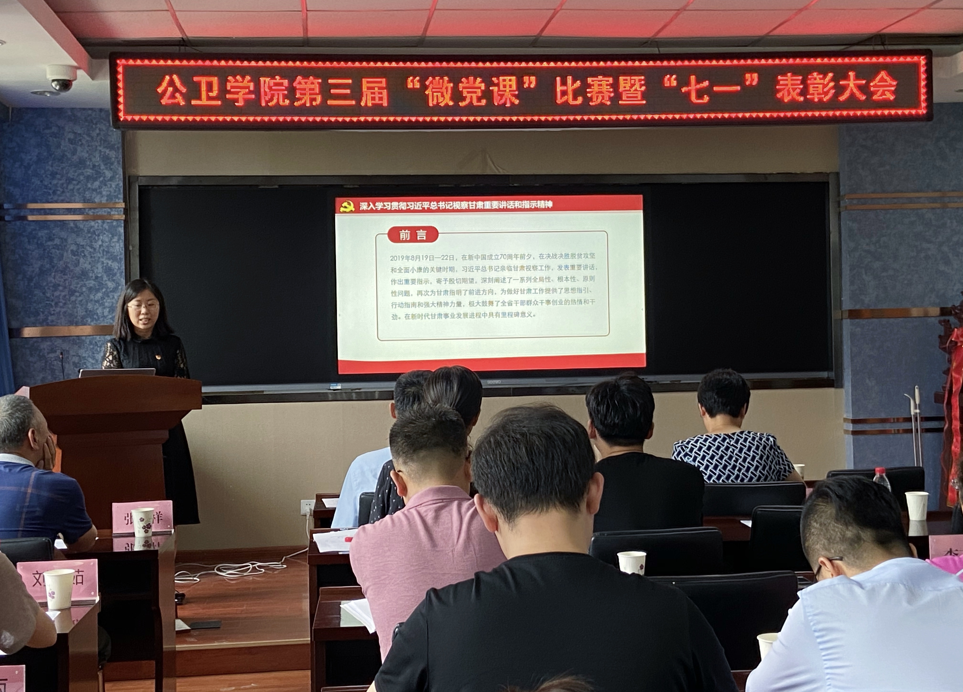 “微党课”比赛暨“七一”表彰大会在庄严的国歌声中拉开帷幕。各党支部代表围绕坚定理想信念、严守党纪党规、牢记党的宗旨、践行初心使命等主题,重点以政治理论、党史教育、打赢疫情防控阻击战、学习身边榜样和决战决胜脱贫攻坚为选题,分别从疫情抗击中的党员担当、中国制度优势、疫情下的食品安全、公卫人的责任与使命等多个角度出发,结合精美的PPT以及丰富的视频资料,层层深入,开展了生动的讲解,在座的党员深受鼓舞,更加坚定了自己的理想信念。