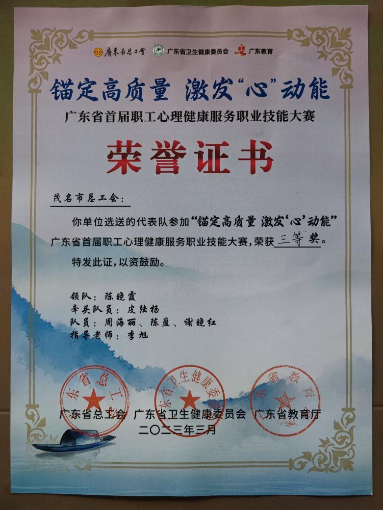 经过复赛(含理论笔试,抢答题,各行业群体职工心理健康筛查(体检)方案设计,心理健康案例分析)、决赛(必答题、抢答题、职工心理咨询技能展示题、“我的职工心理健康服务故事”讲述题)两轮精彩比拼,茂名市总工会代表队以总分第七名的成绩在31支队伍中脱颖而出,成功晋级省级决赛,最终获得大赛团体三等奖。