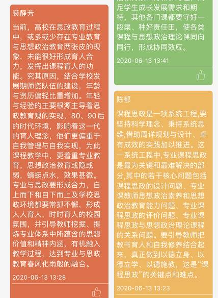夯实理论基础,把课程思政从工作要求转化为政策实施表和行进路线图,其他老师提出了具体的教学实施方策:李琴老师提到“文秘专业教育要深度挖掘提炼专业知识体系中蕴含的思想价值和精神内涵,拓展专业课程的广度、深度和温度,增加课程的知识性、人文性;在实践类课程方面,注重教育和引导学生了解中国传统文化,了解国情民情,树立严谨、高效、合作、奉献的职业精神”;童平老师写道“通过信息化的教学方法适应当下教育潮流,提升学生的思想认知和专业认知后,再引导学生积极进行社会实践,达到理论和实践的统一;陈郁老师还强调“要引导教师把教书育人和自我修养结合起来,真正做到以德立身、以德立学、以德施教”……
