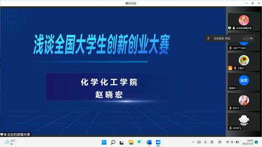 (南昌大学化学化工学院 王振兴讯)创新点燃梦想,创业闪耀青春。为进一步营造学院创新创业氛围,提高教师和同学们对“互联网+”大学生创新创业大赛的理解和认识,由化学化工学院党委主办,化学化工学院“双带头人”支部书记工作室组织,化学化工学院教职工第二党支部协助举办此次“担当作为学先进,争创佳绩做先锋”主题党日系列活动之九暨青年学者论坛之二——互联网+大赛经验分享”线上讲座活动。本次活动邀请了在大赛中取得佳绩的学院样板支部教职工第二党支部赵晓宏老师为大家做报告。赵晓宏老师是南昌大学化学化工学院副教授、硕士生导师,2012年博士毕业于中科院大连化学物理研究所,2012年-2014年分别在德国爱尔兰根-纽伦堡大学和马普高分子所从事博士后和客座研究员工作。其首次参加互联网+大赛就获得了江西省金奖,并指导学生“挑战杯”大赛多次获奖,具有非常宝贵的实战经验。化学化工学院舒涛书记、蔡琥院长、范杰平学科长、及学院其他领导和师生共220余人参加了此次线上活动,会议由工作室骨干成员暨教工第二党支部青年支委王振兴老师主持。