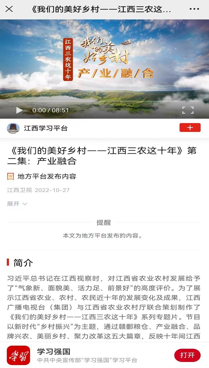 习近平总书记在江西视察时,对江西省农业农村发展给予了“气象新、面貌美、活力足、前景好”的高度评价。为了展示江西省农业、农村、农民近十年的发展变化及成果,江西广播电视台(集团)与江西省农业农村厅联合策划制作了《我们的美好乡村--江西三农这十年》系列专题片。节目以新时代“乡村振兴”为主题,通过赣鄱粮仓、产业融合、品牌兴农、美丽乡村、聚力改革这五大篇章,反映十年间江西农业农村所发展的巨大变化和成就,回应习近平总书记对江西农村发展的殷殷嘱托,震撼呈现江西乡村振兴的壮丽画卷,庆祝党的二十大胜利召开。