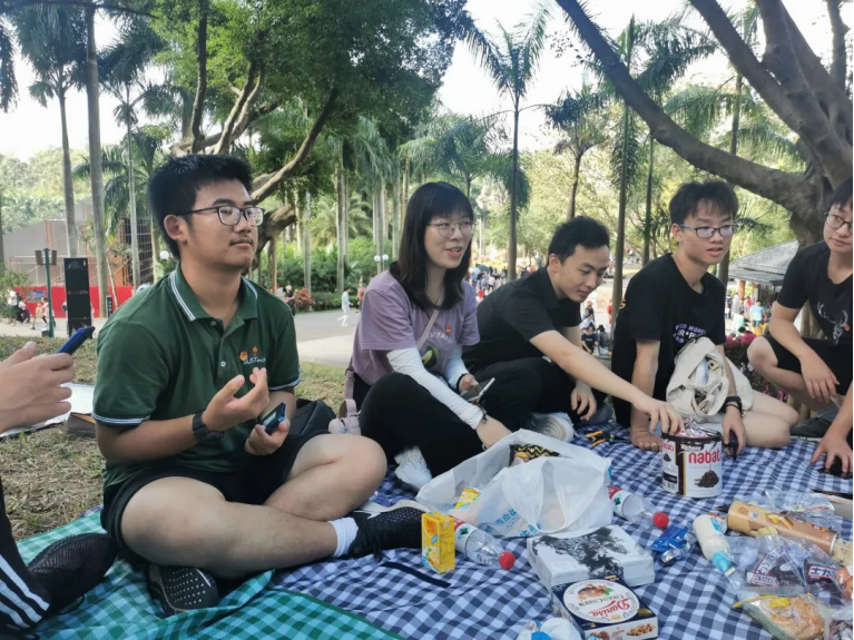 正午时分,冬日暖阳下,大家在阴凉的草坪上展开了交流分享会。