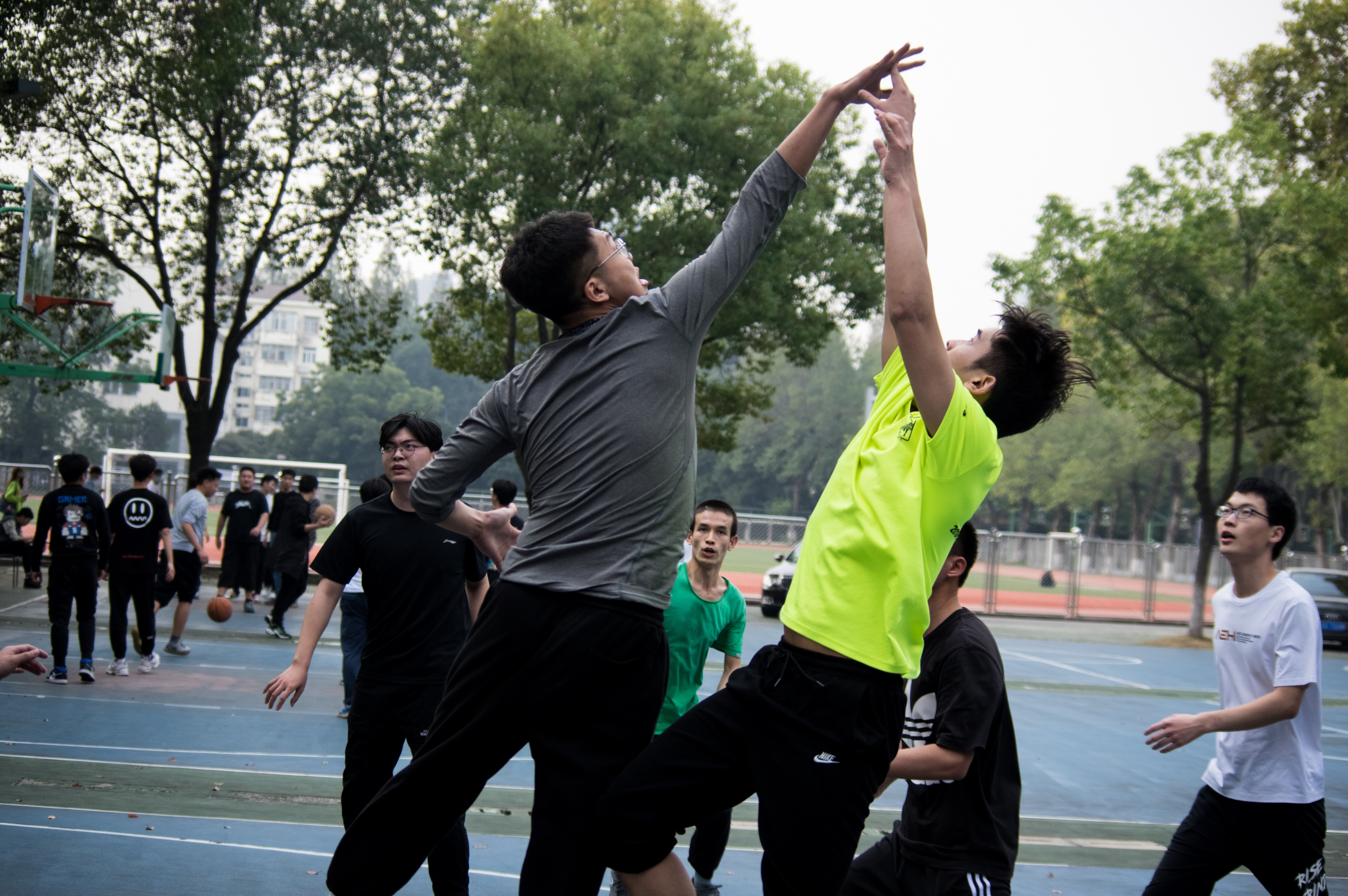 第二场比赛,研二队对战研三队。比赛伊始,由邱明波老师开球,两队实力不相上下,紧咬比分。研三队经验老练,巧用技能,相继命中多球,研二队立马调整,传球组织进攻。经过一番苦战,比分焦灼地来到了7:7。此时,球场上传来了一阵秋风,风中夹杂剑气。研二队拿到球权,周帅三分出手,命中!场下响起了“球迷们”的掌声。研二乘胜追击,球来到了杨钰隆手中,他令人不可思议地连续命中三个中投,气势如虹。比分来到了11:7。还是研二发球,杨钰隆接到队友传球,假装投篮虚晃一枪,随后快速持球突破,欧洲步上篮打进!最终,研二队12:7挺进总决赛!