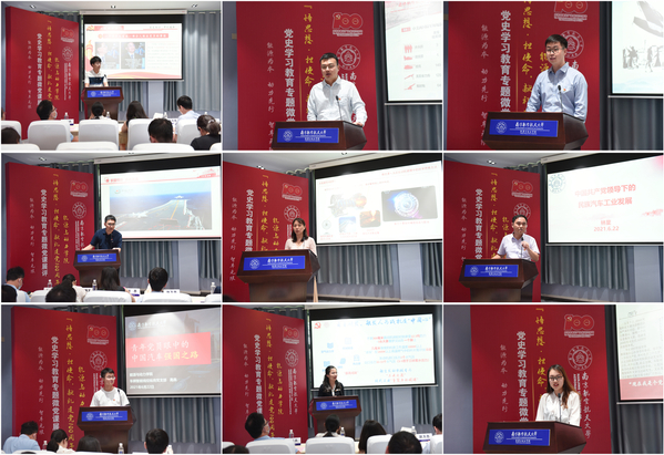 微党课和课程思政展评环节,四位学生党员代表、四位教师党员代表及黎明公司胡建军九位党员以《时代中的青年担当》《传承红色基因,追寻蓝色梦想》《家国情怀体现在生活中的点点滴滴》《新中国民族汽车工业的发展》《浅谈发动机模型辨识方法中的科学思维》等为题,用理性的思考、质朴的语言、真挚的情感,阐述了深化党史学习的思考,分享了参与学习教育的收获,剖析了研究时事热点的体会,展现了师生、职工党员奋发进取的精神状态和学院各党支部开展党史学习教育的工作实效。同时,老师们将党史学习与课程思政相结合,在专业课中讲出了思政味,达到润物无声,盐溶于水的育人效果。学院也一直主动谋划,积极推动课程思政的工作落实,努力开拓课程思政交流平台,发掘课程思政典型,开展有针对性的指导和交流学习,深入推进课程思政与思政工作同向同行,真正发挥协同育人成效。