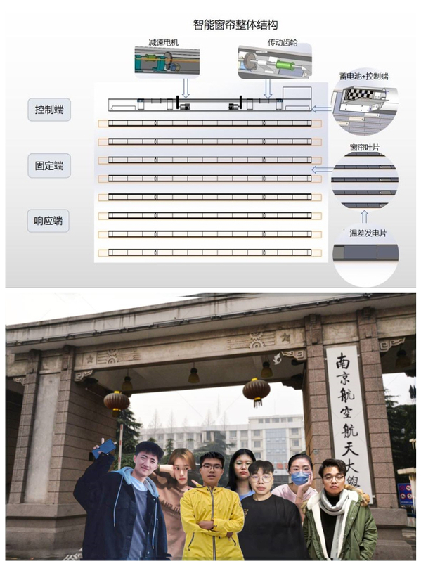 荣获二等奖的项目“‘智启帘心’——基于温差发电的智能窗帘”由岳晨副教授指导,团队由本科生颜闵杰、刘浩、吕志豪、卫宇坤、孙紫琪、余思佳、贾霄彤组成。“智启帘心”智能窗帘利用半导体温差发电技术,利用贝赛克效应将热能直接转换成电能,零污染、可持续、免维修、快响应。电能通过耐热导线传递到升压稳压电路,升压稳压电路将温差发电片输出的电能经过升压稳压处理后传递给充放电控制器来实现电能的储存和利用,以充放电控制器驱动电机工作。通过控制模块中光敏、热敏元件动态评估工作环境,从而自动调节窗帘开合⻆度,优化室内温度、光照环境,实现智能人居的理念与节能减排的充分融合。