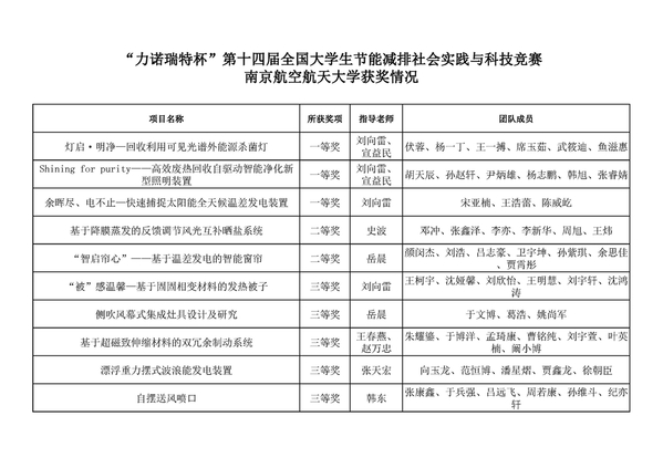 8月28日,“力诺瑞特杯”第十四届全国大学生节能减排社会实践与科技竞赛决赛落下帷幕,南京航空航天大学代表队获得国赛一等奖3项、二等奖2项、三等奖5项,并获得优秀组织奖,创学校参赛以来历史最好成绩。