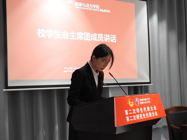会上,杨少川代表学院第一届学生会委员会作了题为《埋头苦干奋勇前进团结全院同学为建设一流的能源与动力学院贡献青春力量》的工作报告,李桐代表学院第一届研究生会委员会作了题为《奋进新征程启航新时代团结广大研究生为建设航空航天民航特色鲜明的高水平研究型大学贡献力量》的工作报告。
