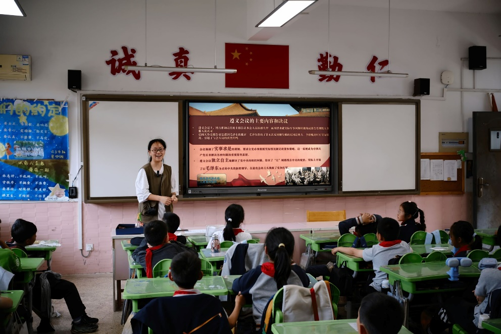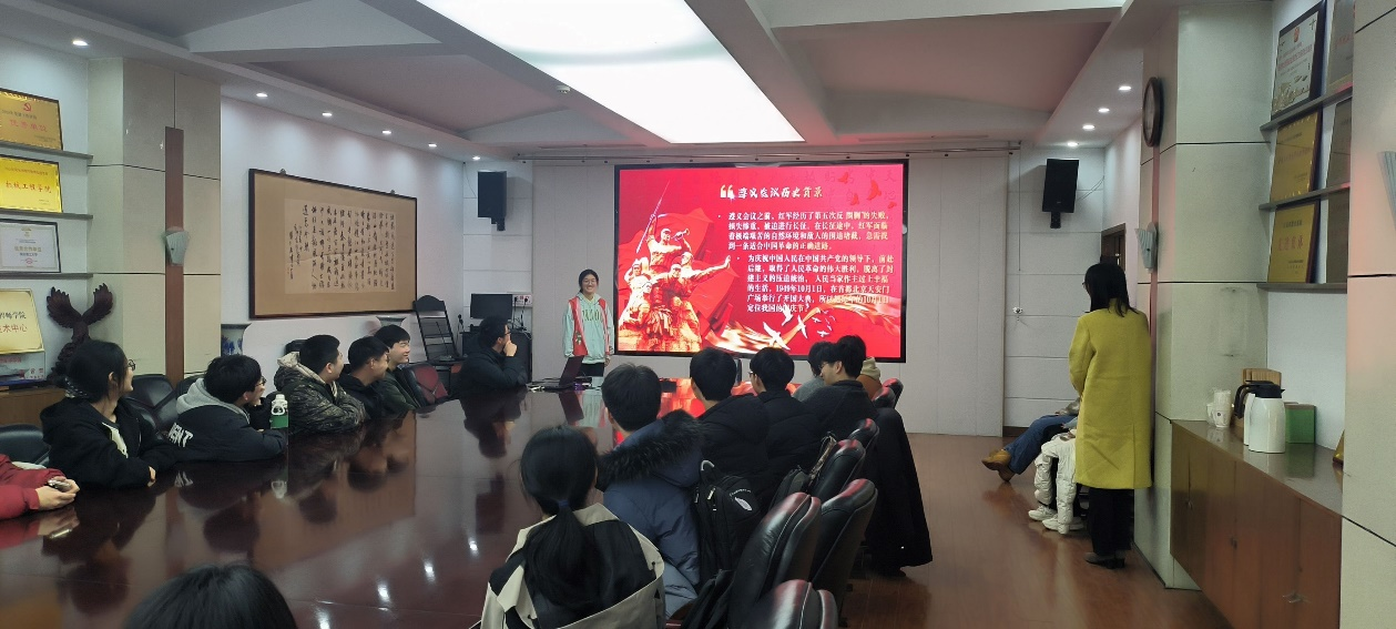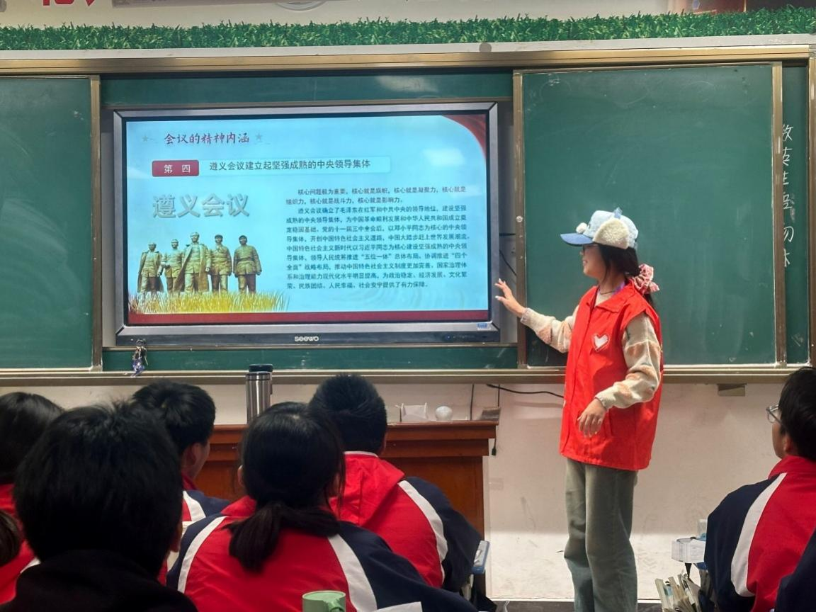 成员们着重梳理了遵义会议的主要内容和重大成果,包括会议如何调整党中央和红军的领导机构,制定新的战略方针,扭转军事被动局面等。在讲解过程中,宣讲团通过PPT的展示与讲解,让观众们直观的理解遵义会议的意义与重要性,体会革命先辈们为了真理和理想,敢于坚持、勇于纠错的伟大精神。、
