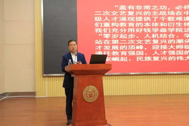 聘任结束后,薛惠锋教授作了《攀登第二次文艺复兴时代的教育顶峰》的主题讲座,这也是钱学森论坛系列讲座的首场报告。薛教授从解读钱学森之问入手,回顾了哥廷根学派的思想精华在普朗特、冯卡门、钱学森之间的传承,总结了钱学森融汇东西方优势的求学和成长经历,并从教育本体和教育衍生体两个维度,阐述了“冒”出杰出创新人才的变革性的教育理念,提出了加强钱学森学院人才培养的理念、举措和目标等教育变革建议。