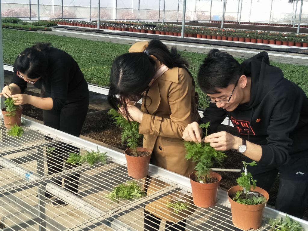 随后,教学示范岗陈素梅教授对青年教师们进行了菊花嫁接技术的现场教学,年轻教师们通过实践练习,熟练掌握了砧木黄蒿处理、接穗的削取、包扎等嫁接技术要点。