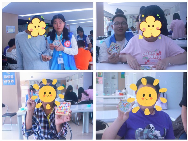 夏日限定,色彩无限。志愿者们用简单的语言和形象的图片与学员积极交流互动,手把手与学员们共同制作马赛克杯垫,学员们精心挑选着各色马赛克碎片,借助胶水在木制底盘上拼出自己喜爱的的图案,沉浸在创意的世界中。