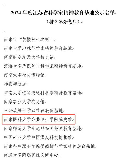 近期,首批江苏省科学家精神教育基地名单出炉,全省20家教育基地入围,有效期为5年,公共卫生学院院史馆成功入选。