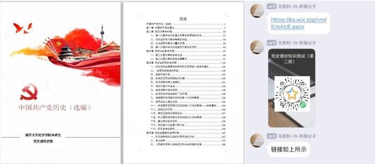 为将党史学习教育常态化、实效化,支部设置了特色学习小组,不断丰富党史图书角书籍,编写支部党史手册。学习小组每日在支部信息群推送党史知识学习卡片,并编写党史学习题库用于每周学习考核,该活动已进行8周。此外,支部在每月主题学习之后,设置固定的党史学习考察时间,同时利用NK化学家学院公众号进行“红色领诵——化读经典”毛泽东选集专题推送,现已发布23期。支部一系列学习活动,将党史学习融入平时生活,对提高支部成员理论知识素养具有积极作用。