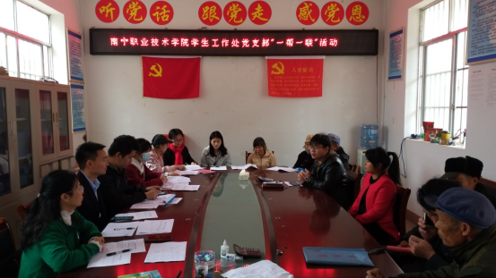 11月26日,学生工作处党支部前往上林县乔贤镇绿浪村开展“一帮一联”暨主题党日活动并在村委召开座谈会。学生工作处支部党员、绿浪村第一书记欧阳威、帮扶对象等参加座谈会。