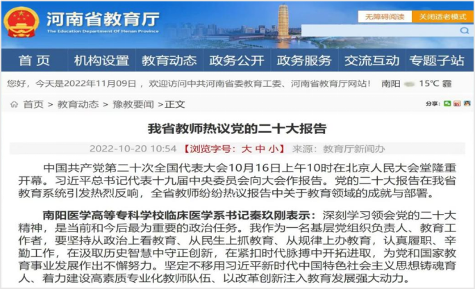 1.党建引领,学习赋能。党的二十大胜利召开以来,我系通过多种方式认真学习贯彻二十大精神。系党总支书记秦玖刚热议二十大报告的学习体会被河南省教育厅网站发表,在全系掀起了学习二十大精神的高潮。通过开展党课,召开教学工作会,在师生中宣讲党的二十大精神。组织党员干部参加“奋进新征程 建功新时代”在线答题活动,收看党的二十大精神专题培训,把广大师生的思想和行动统一到党的二十大精神上来,为教育教学工作发展注入强大动力。