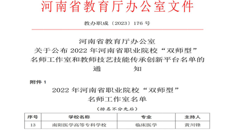 5月17日,河南省教育厅公布2022年河南省职业院校“双师型”名师工作室和教师技艺技能传承创新平台名单,我校黄川锋老师主持的临床医学专业“双师型”名师工作室获批立项。这是继3月份我校临床医学系教师党支部获批省级“双带头人”教师党支部书记工作室之后的又一成果。