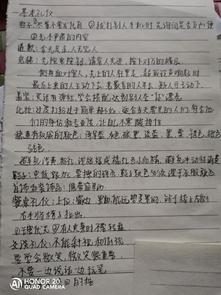 不学礼●无以立,大学生的修养与礼仪。朱老师讲了许多不同场合中应该保持何种礼仪。最普通的姿态--坐姿能展现出一个人的文化修养;拨打对方手机时,要先询问对方是否方便;人无完人,每个人都会有犯错的时候,无意冒犯了别人时,要真诚的道歉(表现出歉意即可);职场中的穿搭也体现出一个人的修养;参加重要会议或者聚餐,要适当的化妆……种种的礼仪都会在陌生人或者长辈面前展现出自己的修养。说话是我们日常生活中的基本,面对陌生人或者长辈、领导,我们要善于倾听,不可贸然打断,要善于简练的表达自己的想法,和不同的人交谈,要进行不同的话题。这次会议,我掌握了很多基本礼仪,虽然还没有过多的接触大社会,但是修养是一天天养成的。