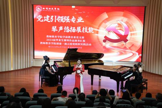 音乐会通过钢琴独奏、二重奏、八手联弹等形式,奏响《我和我的祖国》等经典红色篇章,弘扬爱党、爱国、爱人民的优秀传统和思想正能量。教师教育学院学前教育系党支部、学生第一党支部以党建为引领,以学生为中心,以艺术教育为载体,以教学实践为平台,挖掘艺术实践的育人价值,深化艺术思政教育的理论与实践研究,近年来持续打造“艺术党课”育人品牌,将思想政治教育融入学科建设、专业课程、艺术创作中,推进党建品牌与艺术教学深度融合发展,构建党建品牌实践模型的育人途径。