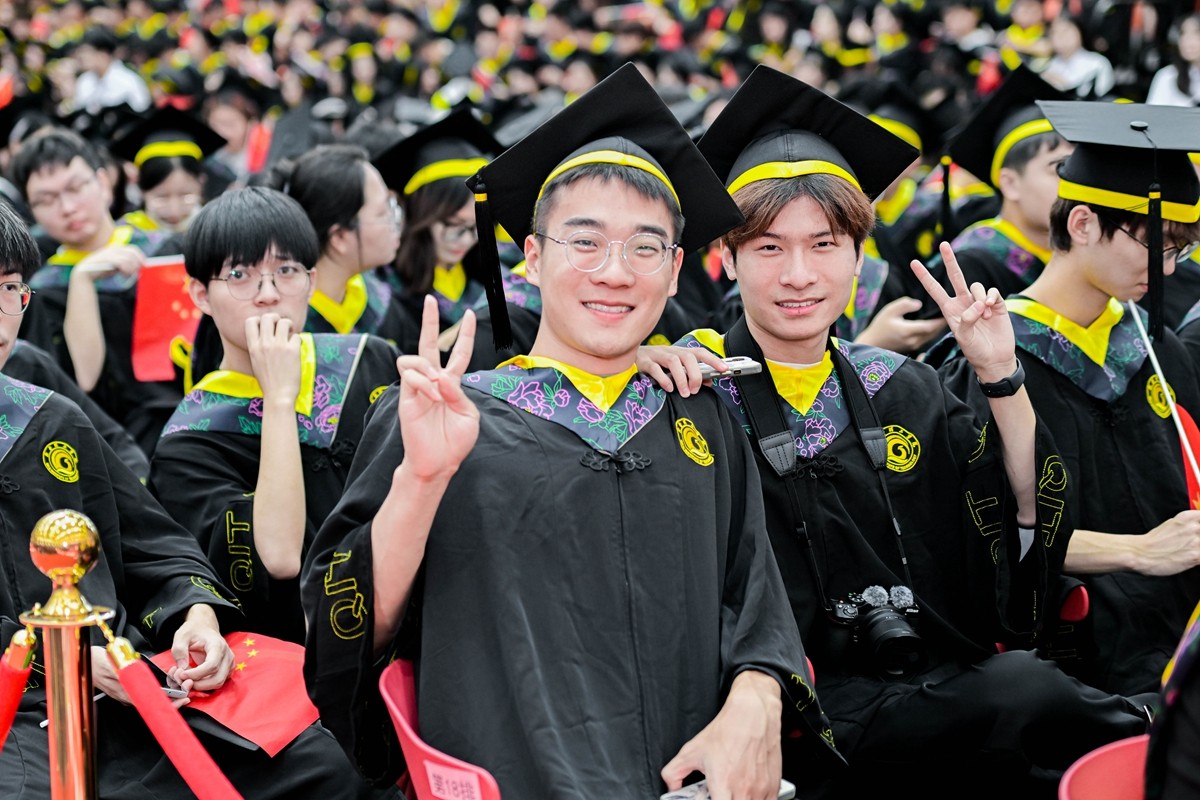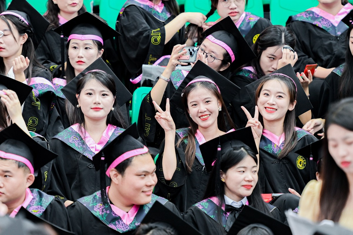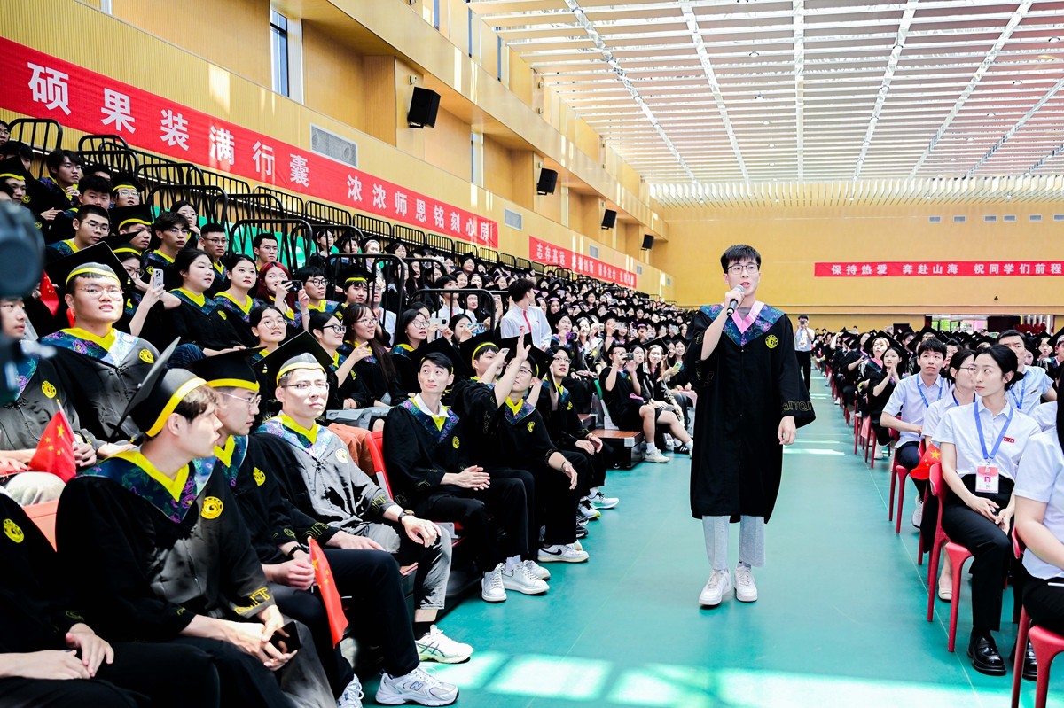 新闻与传播学院马绪威、文学院蔡智远代表全体毕业生发言,计算机与信息工程学院执行院长付海燕、艺术学院执行院长高良博分别代表教师发言。