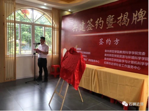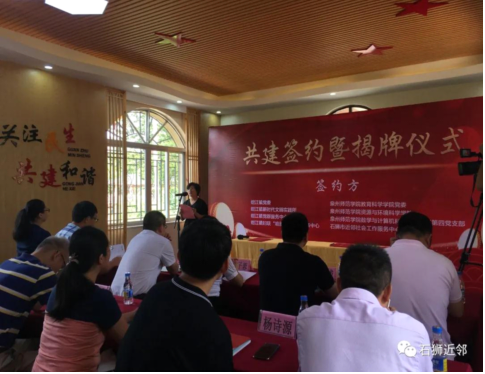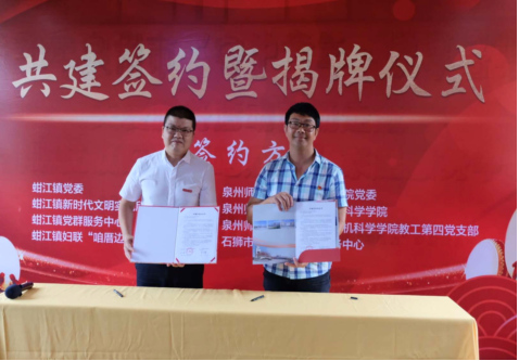 8月10日,中共泉州师范学院教育科学学院委员会与中共石狮市蚶江镇委员会共建签约仪式在蚶江镇党群服务中心举行。泉州师院教科院党委书记陈一祥、石狮市蚶江镇党委书记李怀忠、教科院团委副书记林翠玲、石狮近邻社工服务中心副理事长林玲玲、教科院教工第一党支部许松芽副教授出席签约仪式,石狮市委组织部、石狮市委文明办、石狮市民政局、石狮市妇联和蚶江镇有关领导,党员志愿者、青年志愿者和新时代文明志愿者、各村妇女执委、蚶江镇辖区学校代表参加共建签约仪式。