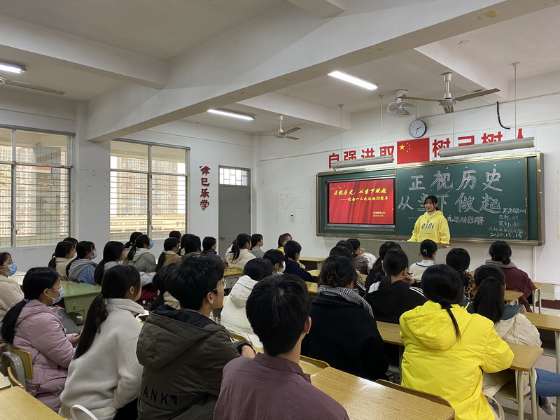 为纪念“一二·九”抗日救亡爱国运动85周年,弘扬爱国主义精神,外语旅游学院于2020年12月16日下午14:30在教学楼组织20级团支部开展“正视历史,从当下做起——纪念一二·九运动85周年”主题团会。