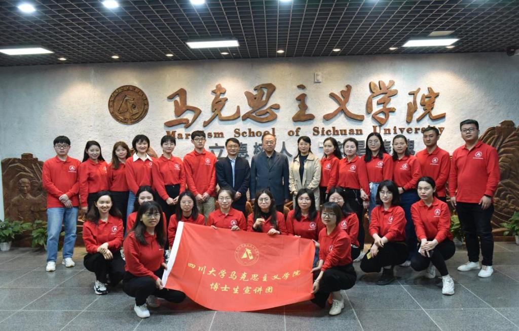我院博士生宣讲团团长2020级博士李凯代表全体成员发言。他说到,宣讲团成员进一步认真学习党的历史,坚持理论联系实际,切实讲好“中国共产党为什么能”、“马克思主义为什么行”、“中国特色社会主义为什么好”等一系列重大理论与实践问题,同时将会创新宣讲形式,以丰富的学习载体和多样的学习形式,使宣讲变得更加生动鲜活。通过理论宣讲切实展现川大马院学子的担当与作为,奉献川大青年的智识与力量。