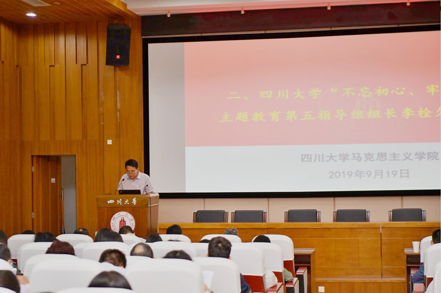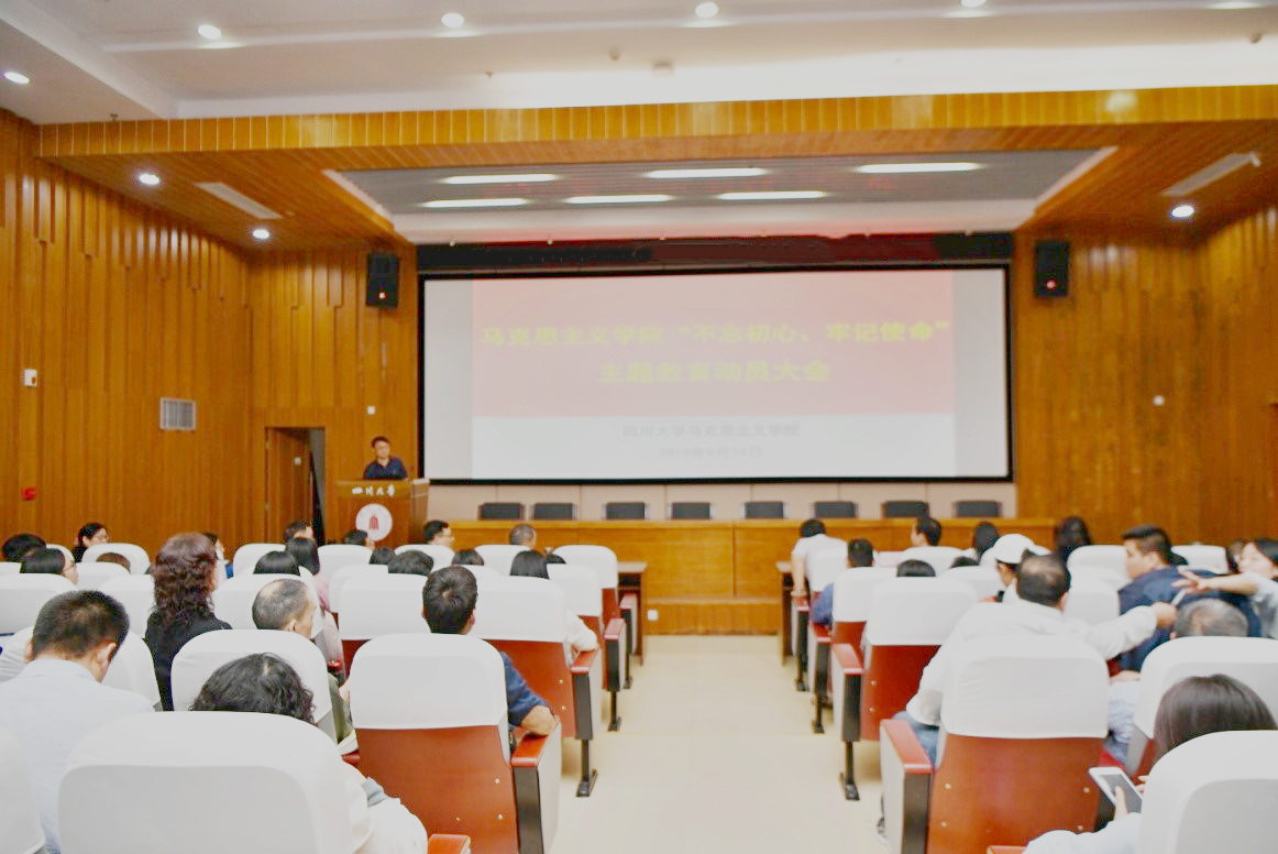 9月19日下午,四川大学马克思主义学院“不忘初心、牢记使命”主题教育动员大会在江安校区文科楼负一楼报告厅举行。学校“不忘初心、牢记使命”主题教育第五指导组全体成员、学院全体中层领导干部及两委委员、全体在职教职工党员、离退休党员代表、学生党支部书记及学生党员、部分非党员教职工和学生出席会议。学院党委 书记刘吕红作动员讲话,对学院开展主题教育进行安排。学校主题教育第五指导组组长李栓久部长代表指导组讲话,对学院开展主题教育提出指导。会议由学院党委副书记刘渊主持。