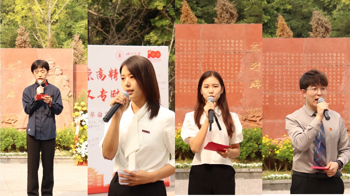 活动在庄严的国歌声中开始。在肃穆的纪念碑前,全体师生怀着无比崇敬的心情向为中国人民解放事业英勇献身的烈士默哀致敬。国旗班成员代表全体师生向英烈碑敬献花篮。随后,档案馆馆长毕玉讲述了川大英烈的革命故事,与现场师生一起重温了川大的红色历史。郭勇向学生代表赠送“四川大学革命英烈丛书”,勉励川大学子铭记先烈事迹,传承红色基因。“江姐班”学生代表深情朗诵诗歌《英雄》,在场的师生依次走到纪念碑前敬献手中鲜花,深切缅怀为国家独立和民族解放牺牲宝贵生命的革命先烈们,表达了川大师生弘扬红色精神、践行时代使命的决心。在红色故事分享会环节,来自“江姐班”和四川大学“党的十九大精神”学生宣讲团及博士生宣讲团的四位同学为大家分享了江竹筠、王右木、恽代英与杨闇公四位川大革命烈士的英雄事迹,号召全体川大人学习革命先辈崇高精神,争做又红又专时代新人。