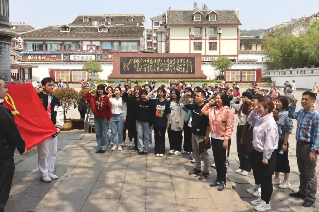 参观结束后,商英党员师生们来到遵义老城子尹路96号会议旧址前重温入党誓词,这栋两层高的砖木结构小楼静静矗立,在阳光照射下,显得古朴庄重,仿佛革命先辈正静静地凝望新时代党员同志。