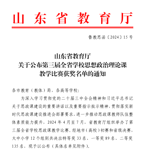 2024年8月,山东省教育厅公布第三届全省学校思想政治理论课教学比赛获奖名单,马克思主义学院教师栾冰冰获该项比赛高职高专概论组二等奖。
