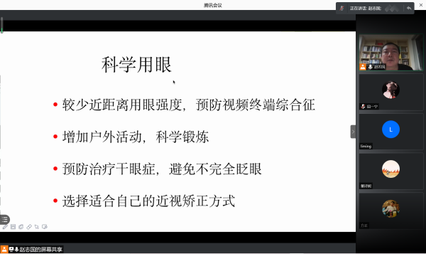 赵志国医生以“不可忽视的近视眼并发症”为主题,从近视的原理、危害以及科学用眼建议等方面进行了详细讲解。他用照相机作比,生动直观地介绍了近视原理,深入浅出地阐述了影响近视的因素和近视的产生原因及危害,全面介绍了病理性近视的原理,并对青年学生科学用眼和合理矫正近视提出科学建议。