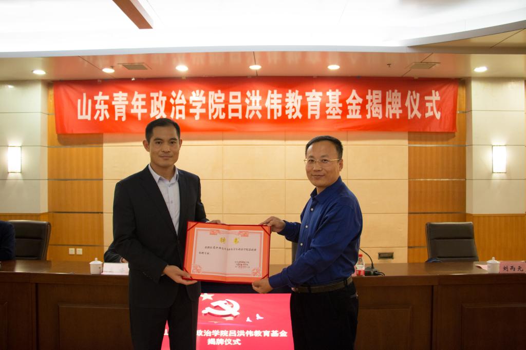 学校党委副书记、山东青年政治学院教育发展基金会理事长高峰向吕洪伟先生支持学校教育事业发展的慈善义举表示感谢,介绍了学校各项事业快速发展及取得的显著成绩。他指出,吕洪伟教育基金的设立不仅体现了吕洪伟先生对学校教育事业的关心支持,展现了心怀社会的情怀和担当,更是对增强学校办学实力、拓展办学资源的大力支持。他要求,教育基金、马克思主义学院要把款项真正用到学生成长、学院发展和学科建设中去,切实发挥好教育资金的支持效应;教育发展基金会要积极主动地推进学校与吕洪伟先生所创办的企业开展深入交流与合作,拓展更多的办学资源和发展机会,助力学校服务地方经济社会发展,不断开创学校发展新局面。