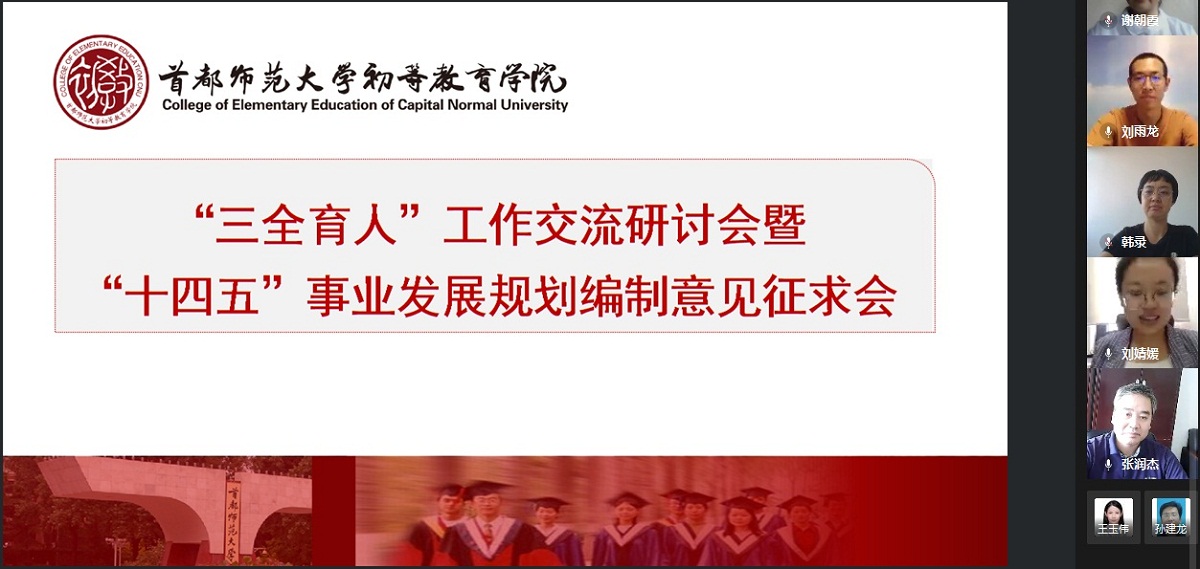 7月14日,初等教育学院在线召开了教育部“三全育人”综合改革试点建设工作交流研讨会暨“十四五”事业发展规划编制意见征求会。学院领导班子全体成员、各职能部门负责人参会,会议由学院党委副书记刘婧媛主持。