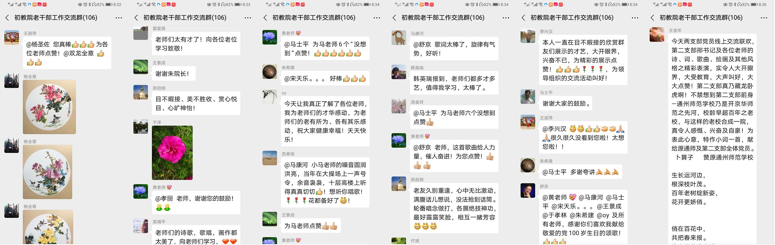 正值红五月,又恰逢两会召开。在这阳光灿烂的日子里,初教院离退休教职工第一党支部和第二党支部联合在“初教院老干部工作交流群”里组织了一次“红五月赞”主题教育活动。