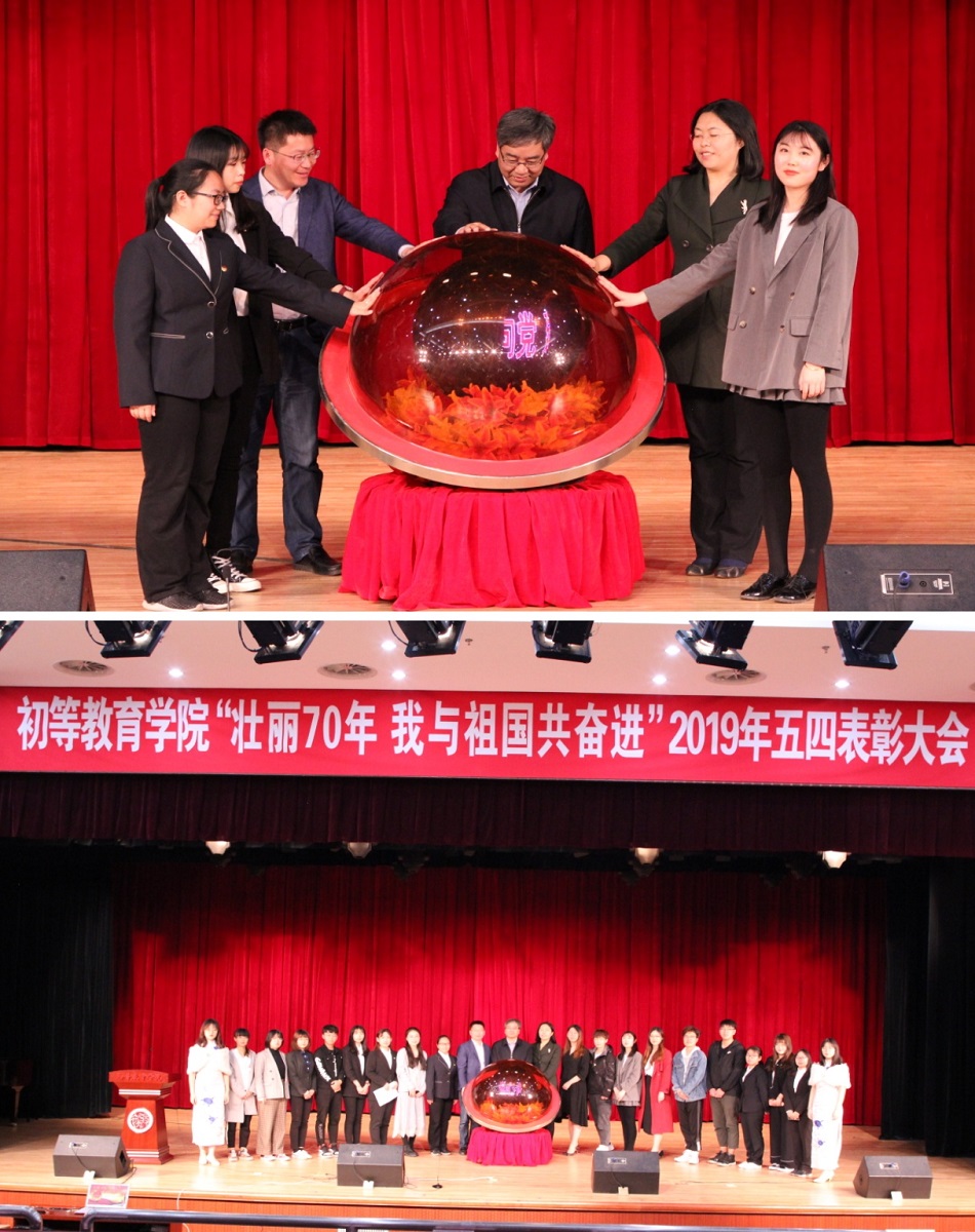 2018年,初等教育学院入选教育部首批“三全育人”综合改革试点院系,学院团委紧紧围绕“提高人才培养质量”这一中心工作,在思想育人、组织育人、第二课堂建设、美育和实践育人方面取得一定成效。为鼓励先进,树立典范,影响带动更多广大共青团员, 4月25日16:00,在东校区教学楼三层演播厅开展2019“壮丽70年,我与祖国共奋进”五四表彰大会暨“青春心向党 建功新时代”爱国主义教育实践活动启动仪式。学院党委书记张润杰老师、院长刘慧老师、学院团委书记崔坤杰老师、院招生就业办办公室主任陈源老师以及学生代表200余人参加了表彰会。大会由学院学生团委副书记2017级英语班学生周雯露主持。