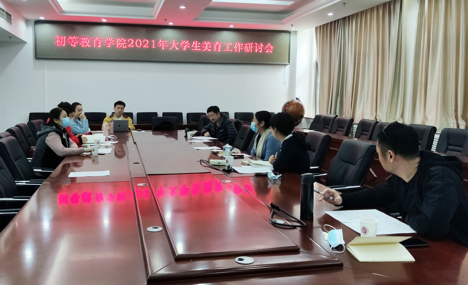 3月15日下午,学院2021年大学生美育工作研讨会在东一区教学楼A座十层会议室举行。学院副院长兼学校美育指导委员会委员俞劼、学院党委副书记兼副院长刘婧媛及艺术类教研室主任、艺术类社团指导教师、童心艺术团分团指导教师、学院团委书记出席会议。会议由刘婧媛主持。