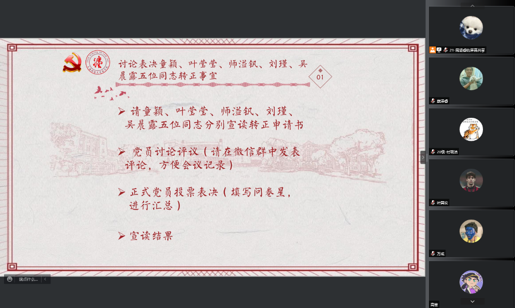 党日活动中,与会的支部党员、预备党员、发展对象、积极分子都积极发言、充分参与到其中。叶柯宏同学为大家讲述了在抗疫斗争中主动承担青年责任的志愿者们的故事;冯熠同学通过天眼团队的事迹向我们展现了青年与国家未来之间的关系,号召同学们树立青年担当;曹云凇同学通过身边同学的志愿服务经历告诉我们青年如何身体力行承担青年责任。