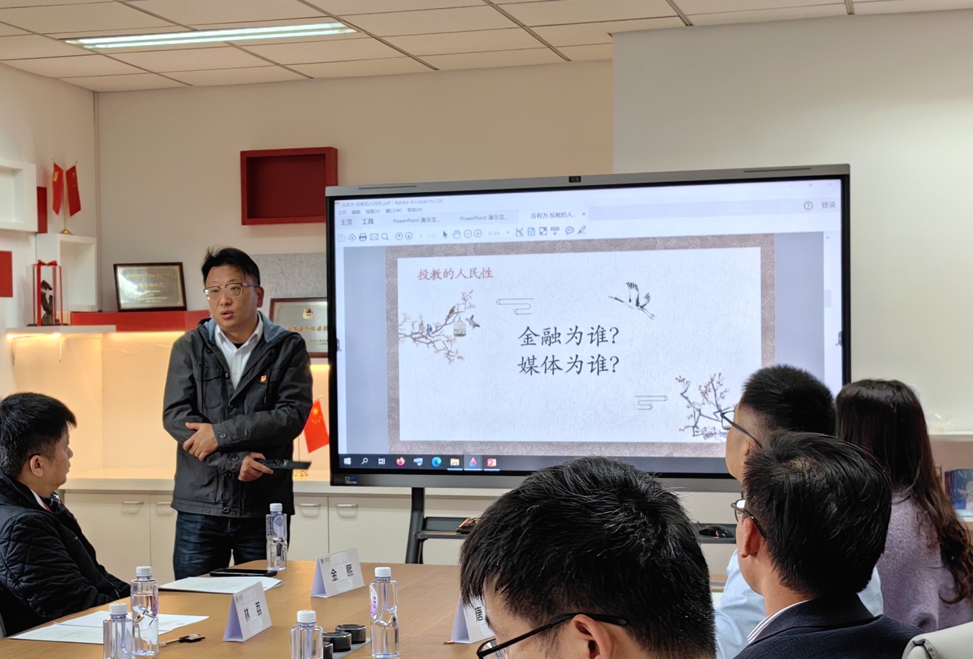 签约仪式后,双方党支部与团委分别开展联建座谈活动。党支部联建会场由学院教师唐珏副教授主持。第一财经视频部副主任陆熠欣、投教视频团队项目制作人应有为与视觉中心高级资深视觉编辑沈倩分别以“第一财经科技视频简介”“投教体现金融和媒体工作的人民性”“视觉和创意的力量”为主题介绍了“财经+媒体”的工作内容,向在场师生展示了第一财经的专业能力与企业风采,展现出科技驱动日益凸显的经济发展新趋势与媒体融合走向纵深的行业发展新动向。