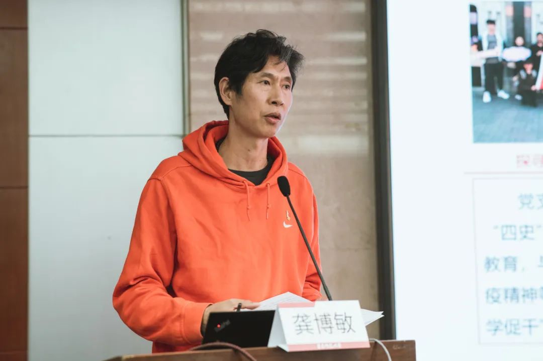 上海中医药大学体育部党支部书记龚博敏作“强基明责铸魂 赓续传统文化 守正创新育人”的分享。从党支部基本情况、党支部建设实践探索、党支部创建成效三方面进行介绍,展示了公共体育与传统文化相融合的独特经验。