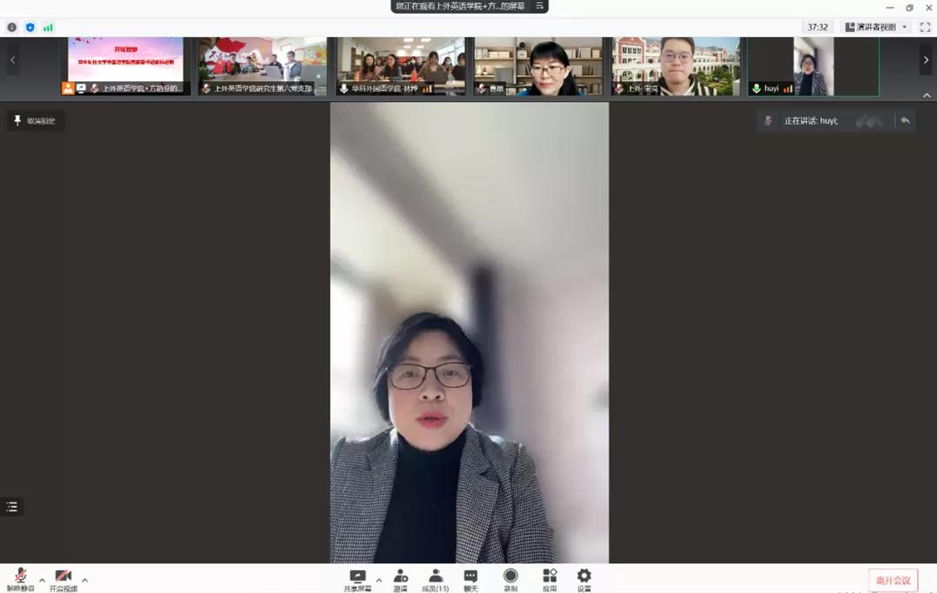 活动开始,曹原老师代表上外英语学院对华科外国语学院接受共建邀请表示感谢,她简要介绍了学院党支部的基本情况和“百+共建”活动,期望未来能有机会进行线下交流。胡祎老师代表华科外国语学院党委向上外英语学院表示感谢,同时表达学院党委对双方进一步交流与合作的期待。