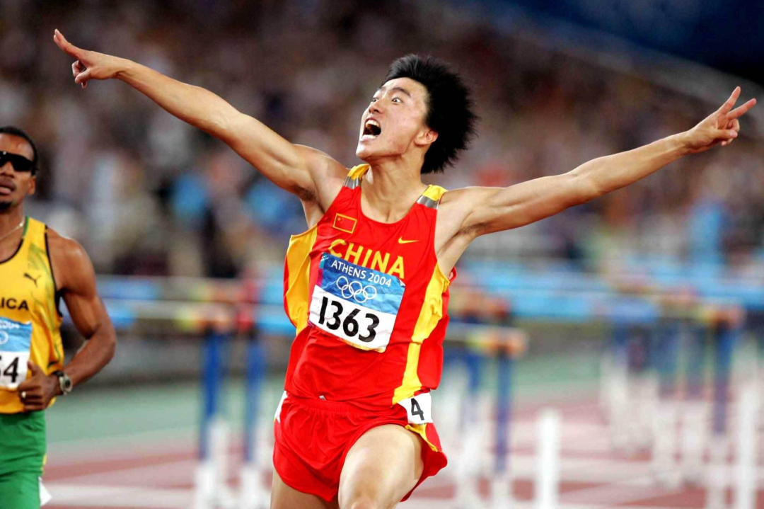 刘翔在雅典奥运会110米栏决赛中夺冠