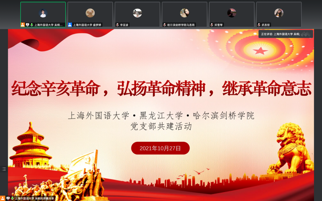 2021年10月27日,上海外国语大学英语学院研究生第二党支部与黑龙江大学西语学院2019级学生党支部、哈尔滨剑桥学院外国语学院学生党支部联合开展以“纪念辛亥革命 弘扬革命精神 继承革命意志”为主题的支部共建活动。支部党员共同观看《光影回溯辛亥革命》片段,用英语讲述革命故事,分享了对革命精神的感知体会。随后,支部党员共同学习了习近平总书记在辛亥革命110周年纪念大会上的讲话,领会习总书记讲话精神。党员们表示,对辛亥革命的回顾,是对革命精神的认识和领悟,作为外语学习者,我们要将中国的革命故事讲述给世界听,把中国的革命精神传递给世界。