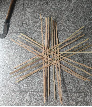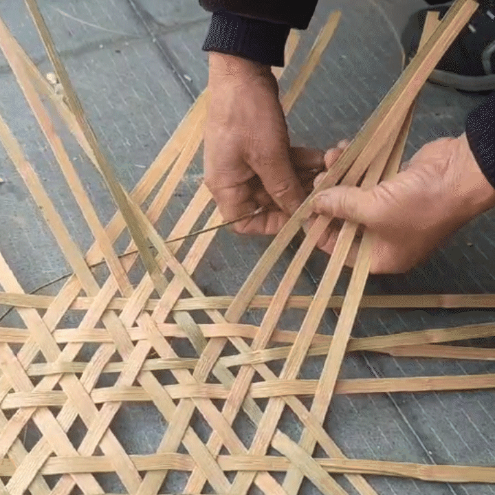 编织竹篮时,手艺人先用两片竹篾叠成十字形,然后在经向和纬向分别以挑一压一的形式添加竹篾。(When weaving a bamboo basket, the craftsman would fold the bamboo strips into a cross and then add a bamboo strip along the warp and weft directions respectively. They weave two-dimensional bamboo planes with the “pick” and “press” weaving techniques.)编成竹篮底部;当经纬向添加竹篾达到所需竹篮底部大小时停止增加竹篾,此时进行纵向收身工序,即用口篾沿着竹圈以螺旋形式将从底部弯起的竹篾紧紧固定在竹圈上形成完整牢固的竹篮身;随后用较粗的竹片完成所需的弧度固定在篮身上成为完整的竹篮;最后将铁丝扭弯,固定成提手。一个竹篮就编织完毕了。