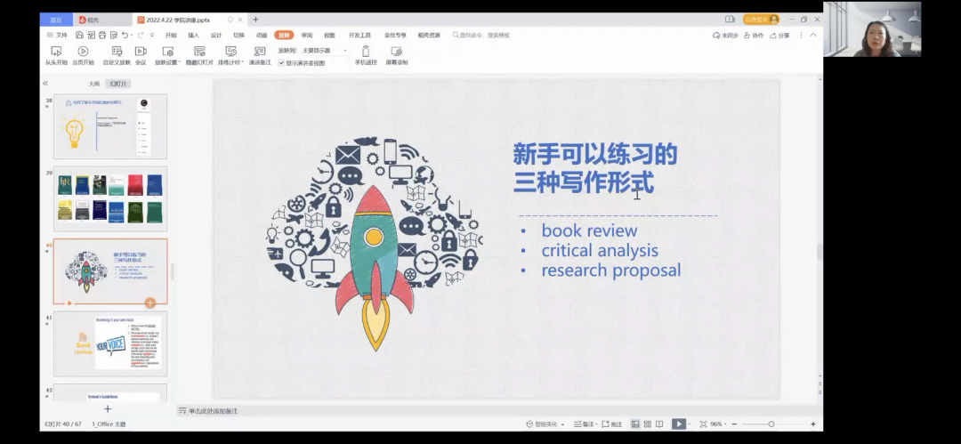 对于刚入门应用语言学的新手,李老师推荐了三种可以练习的写作形式:book review, critical analysis, research proposal。其中李老师就book review这种形式做了详细讲解:书评不只是简单的summary,更强调的是推介人自己的看法与评价。