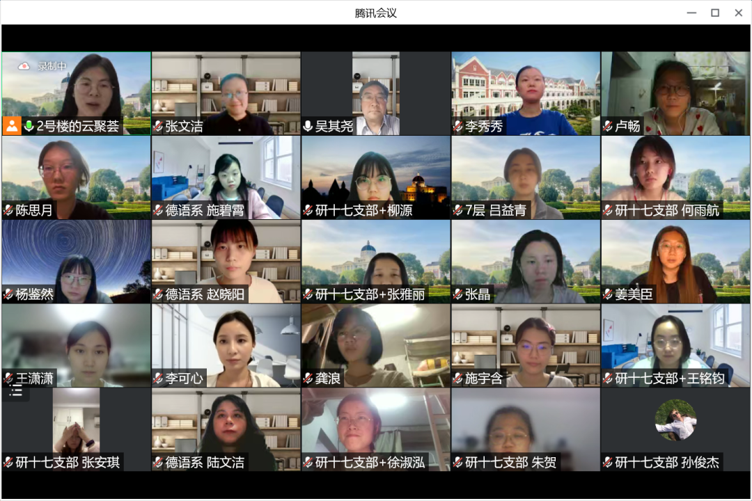 2022年4月22日,英语学院研究生第十七党支部,教学区公寓2号楼第二、三师生联合临时党支部,德语系硕士研究生党支部全体党员,及各党支部联系的团支部成员通过线上“云聚荟”的方式,开展了“传递榜样力量 同心战疫有我”主题党团日活动。英语学院吴其尧教授、教学区公寓2号楼第二师生联合临时党支部书记李秀秀老师、专职组织员张文洁老师参加活动,活动由英语学院研究生第十七党支部书记、教学区公寓2号楼第三师生联合临时党支部组织委员高铭洁主持。